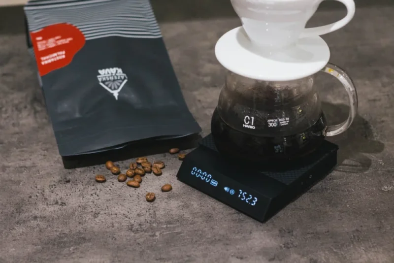 One of the great strengths of this scale is the clear LED display that allows you to read the readings from any angle. In addition to being smaller than the Basic version, the scale also differs in the slanted display. This is a stroke of genius from Timemore and something you don’t see in other scales. So you don’t have to look perpendicularly down at the scale to see what it is displaying. This bevel also allows you to place a larger decanter on the scale, so you can still see the display. The scale also features exceptional accuracy and a wide weighing range: from as little as 0.1 g to as much as 2 kg.