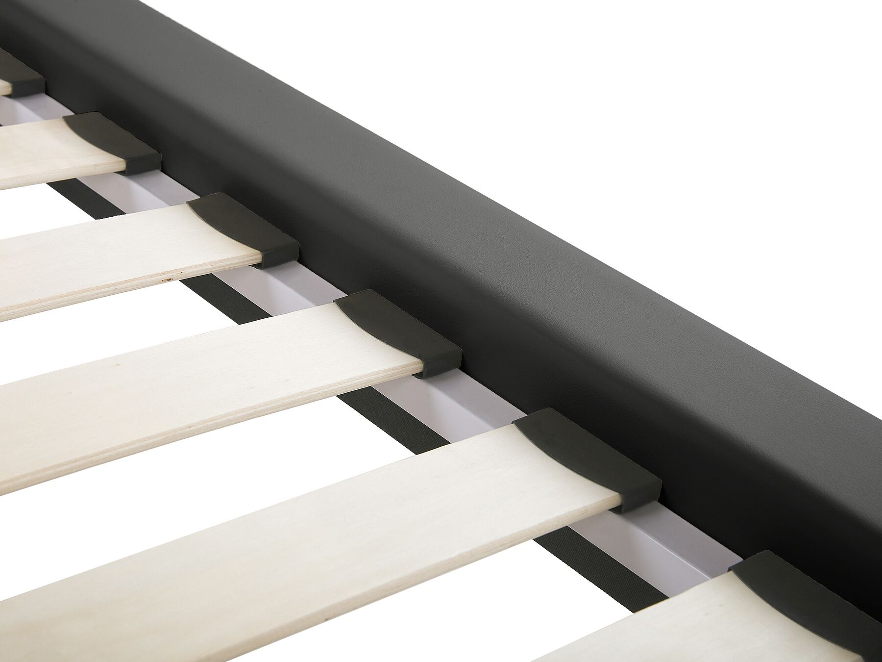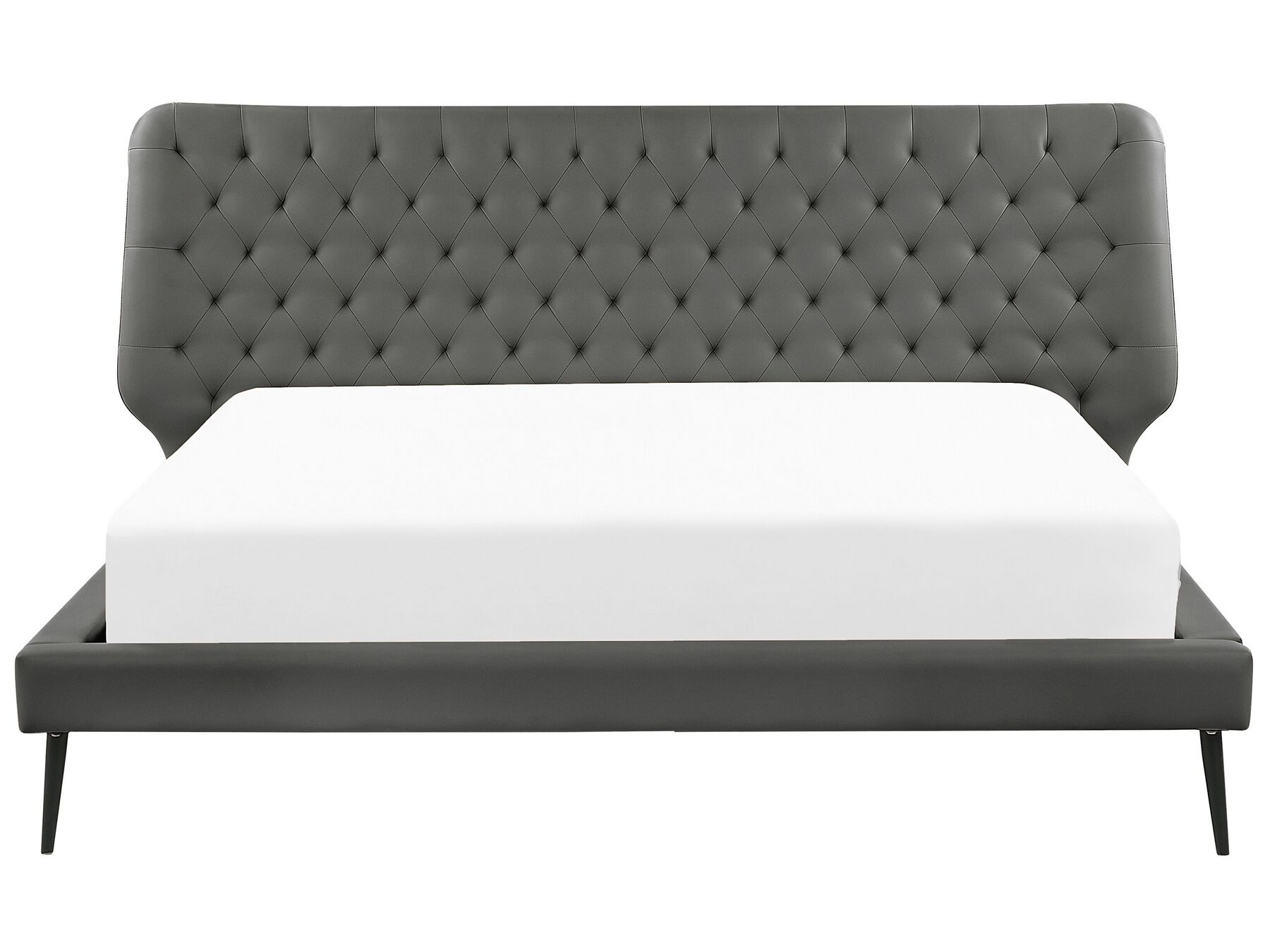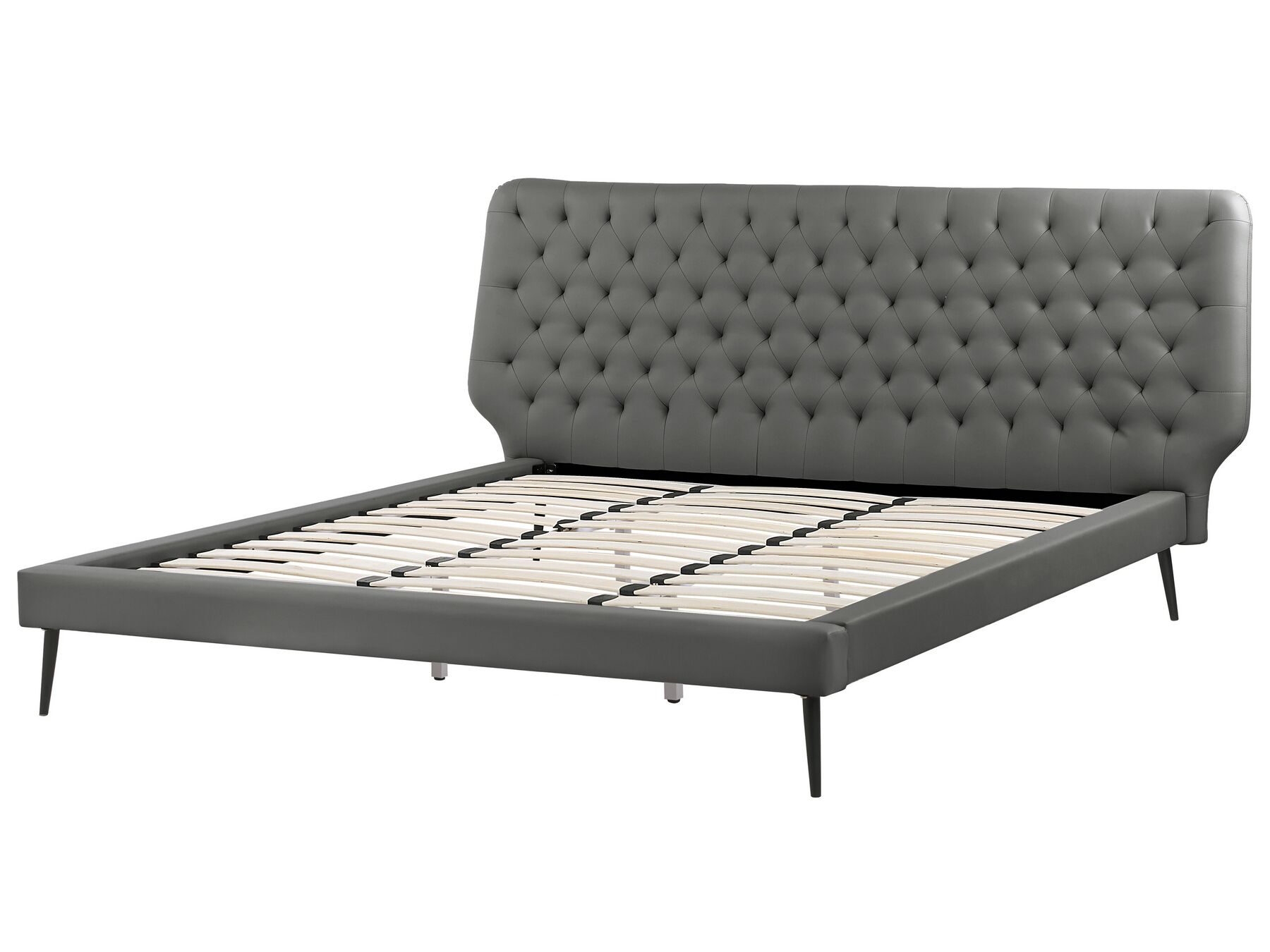 Add a modern vibe to your master suite with this bed frame. Its upholstery is made out of faux leather, meaning the bed is very durable and doesn’t require time-consuming maintenance. Black legs complement the grey colour of the material, while tufted headboard draws attention to the whole construction. Slats, that are included with the bed, ensure both proper bodyweight distribution and relaxing, peaceful sleep.