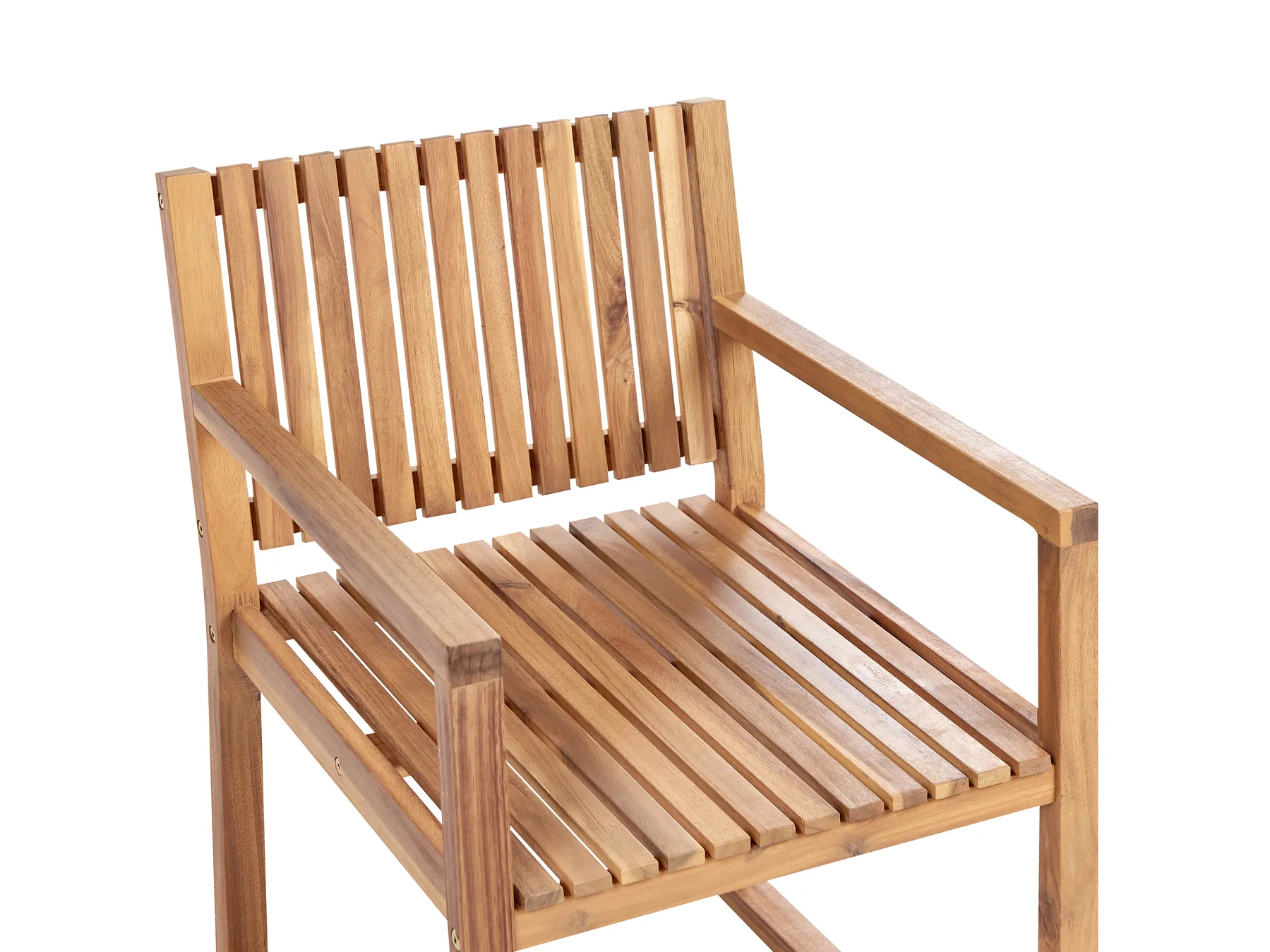 With this wooden set in a simple style, you can create a stylish meeting place in the garden or on the patio for your friends and family. Crafted from certified acacia wood with a trendy slatted design, it blends well with any outdoor décor. The clean-lined table provides enough space for 8 people. Designed with fitted armrests, a wide seat, and a sledge base guarantees high comfort of sitting. Every chair comes with an additional cushion upholstered in a fabric resistant to UV rays in a trendy colour and a thick foam filling, elevating both the comfort of seating and the overall look of the set.
