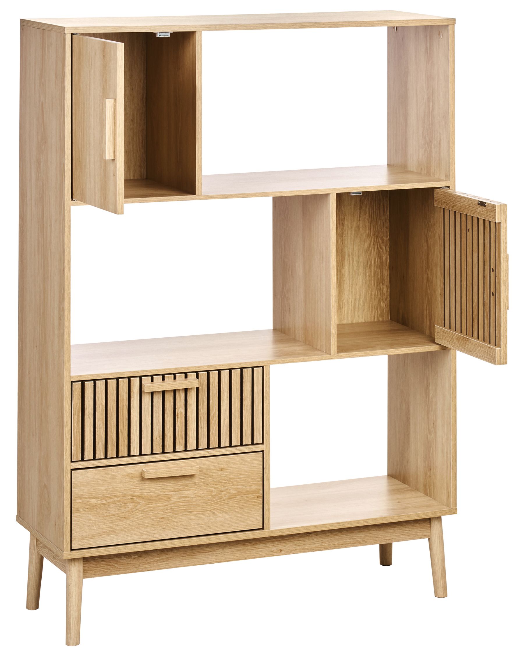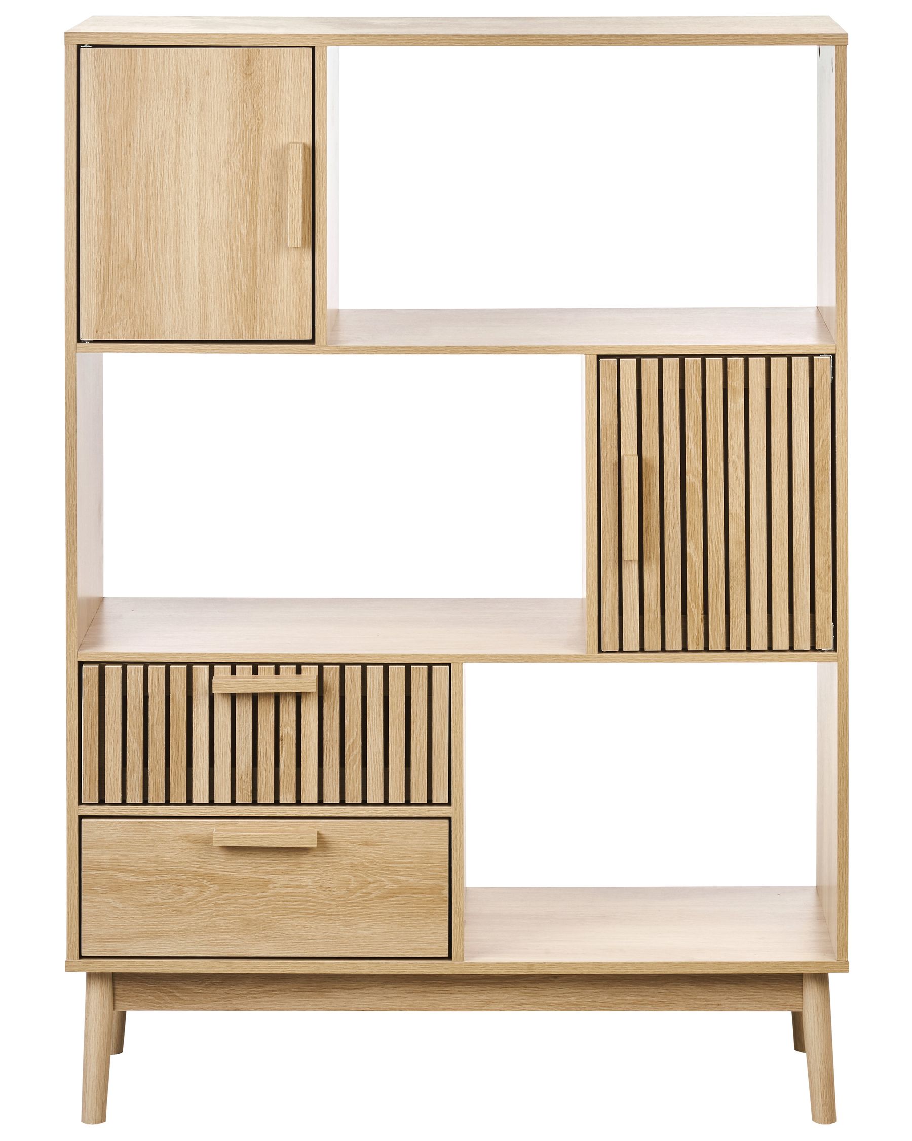 This stylish bookcase crafted from engineered wood brings a natural charm to any room with its wood knot accents and warm tones. It features two drawers and two closed compartments, providing ample space to organise books, decor, or essentials.